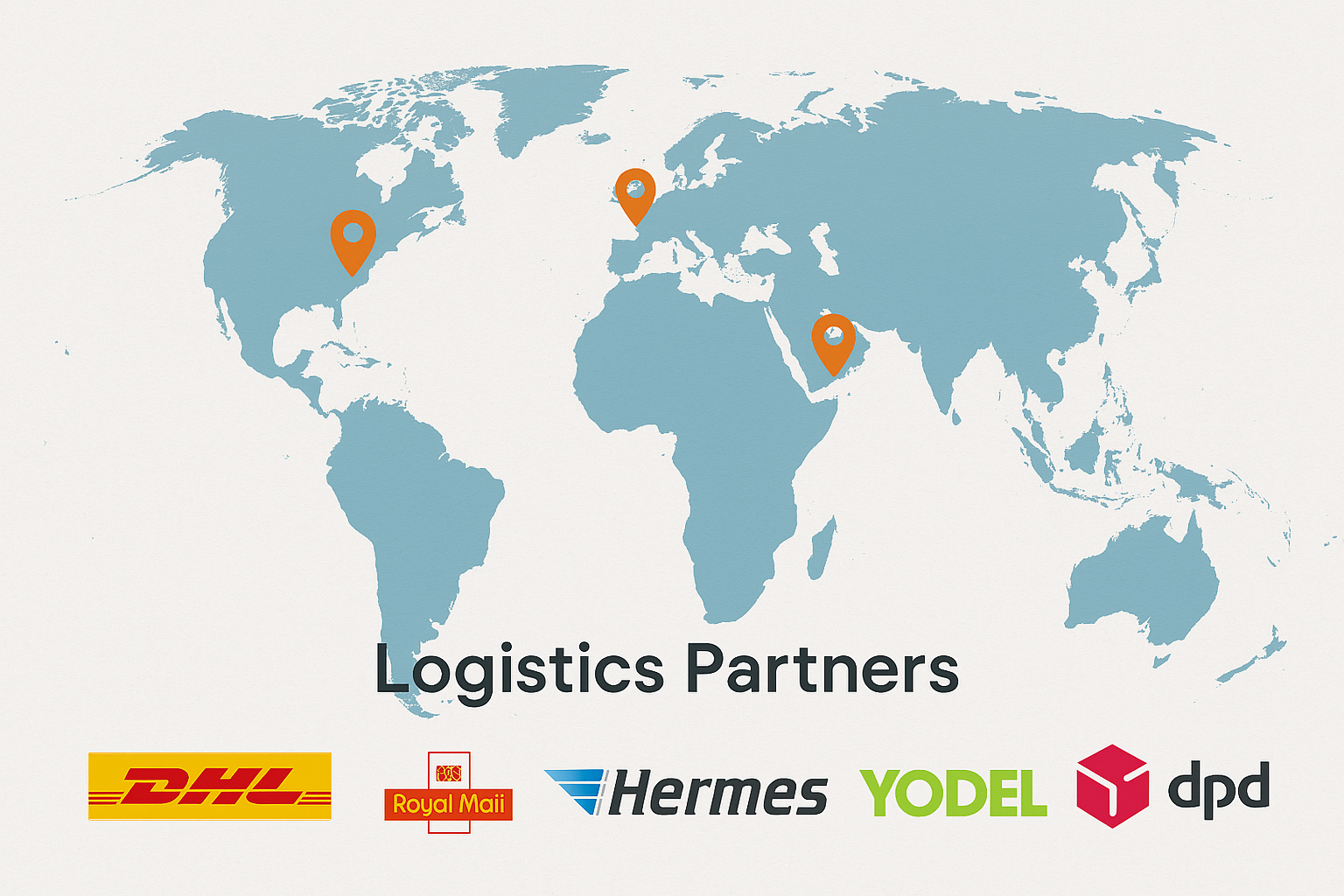 We work with leading delivery providers—DHL, Royal Mail/Parcelforce, Hermes, Yodel, and DPD—to guarantee timely and dependable delivery.